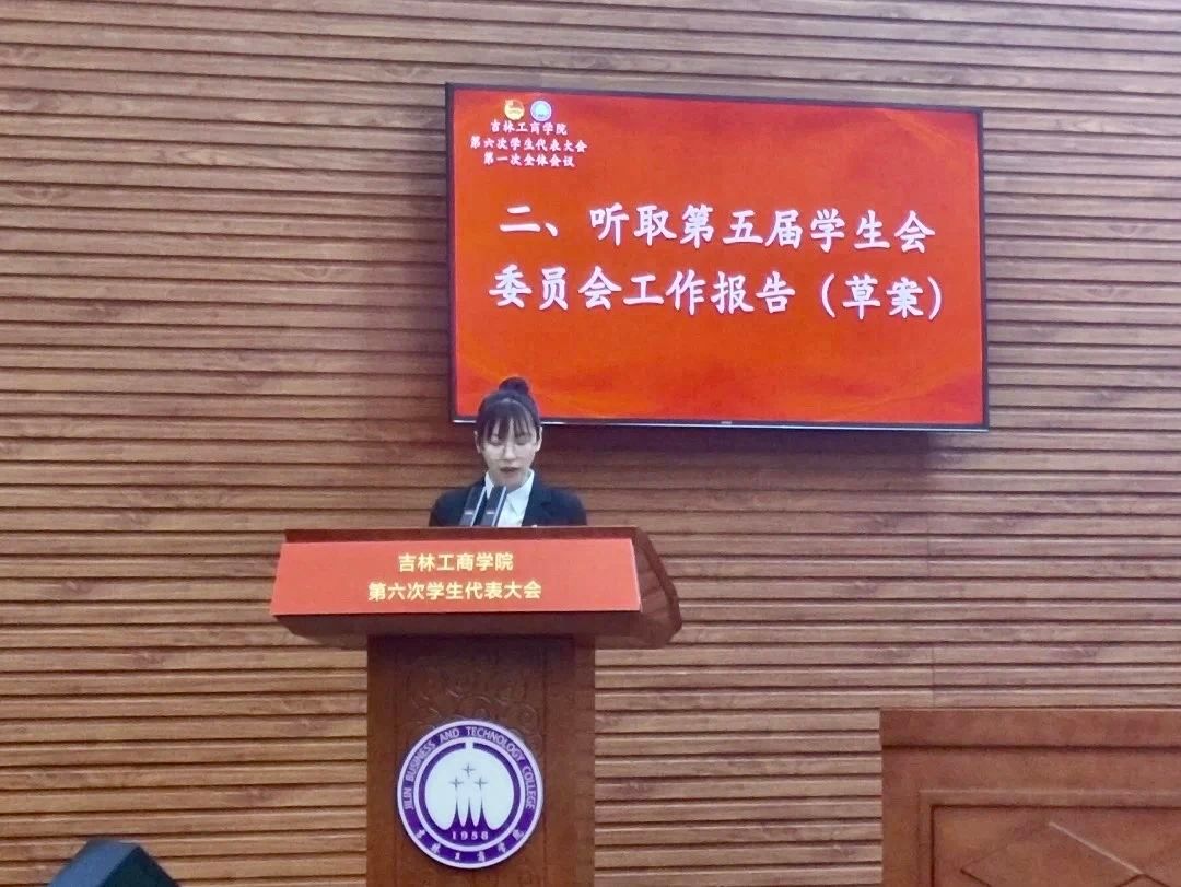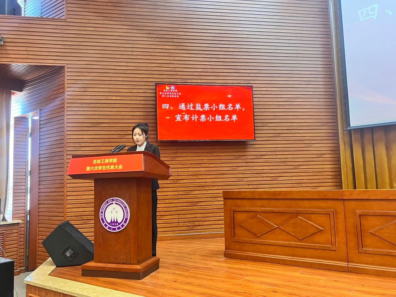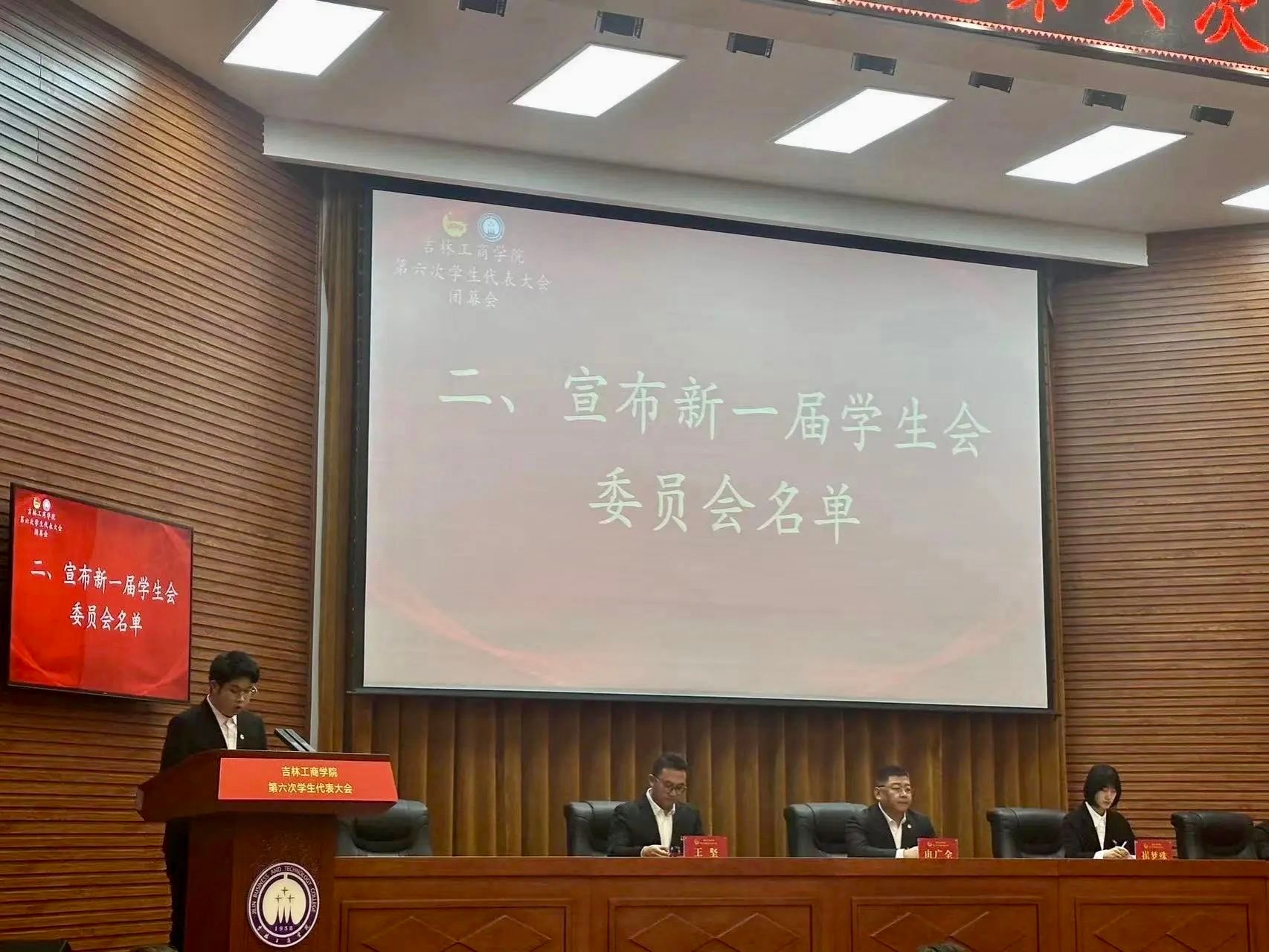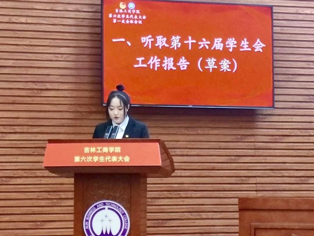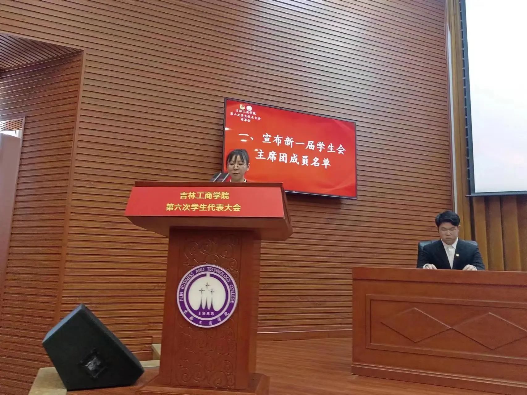 在第二次全体会议上,大会根据《中华全国学生联合会章程》、《吉林工商学院第六次学生代表大会学生会主席团选举办法》的相关规定,经民主投票,差额选举产生了吉林工商学院第十七届主席团和吉林工商学院第六届学生会委员会委员。经全体代表审议表决,通过了第十六届学生会工作报告的决议、通过了第五届学生会委员会工作报告的决议、通过了学生会主席团选举办法、通过了监票小组名单,宣布计票小组名单、通过了新一届学生会主席团成员名单以及新一届学生会委员会名单。